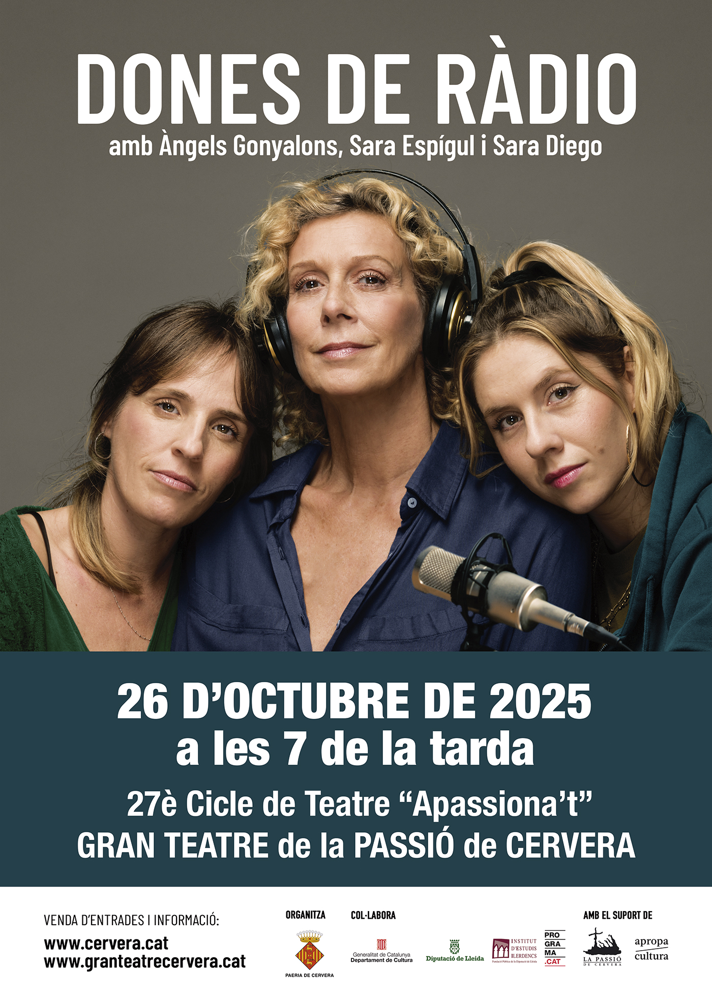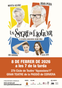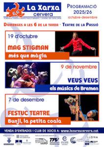 Programació ABBEY ROAD 18 d’octubre a les 20:00h. Cunyades 26 d’octubre a les 19:00h LLAC DELS CIGNES 02 de novembre a les 18:00h. EL POT PETIT 23 de novembre a les 17:30h. Que no surti d'aquí 30 de novembre a les 19:00h Mort d'un comediant 14 desembre a les 18:00h Les Mares 11 de gener del 2026 a les 19h. Un sogre de lloguer 08 de febrer del 2026 a les 19h. Aquí no paga ni déu 25 d’abril del 2026 a les 20h. LA XARXA CERVERA Diumenge 19 d’octubre a les 18:00 Diumenge 9 de novembre a les 18:00 Diumenge 7 de desembre a les 18:00